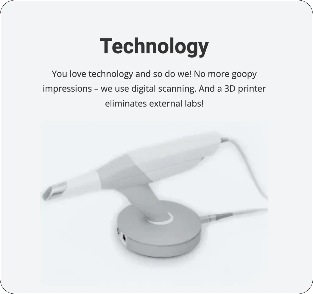 We've invested in the latest technology to make your experience better. With Digital 3D impressions and an on-site 3D printer (no more goop!), you'll actually enjoy the process.